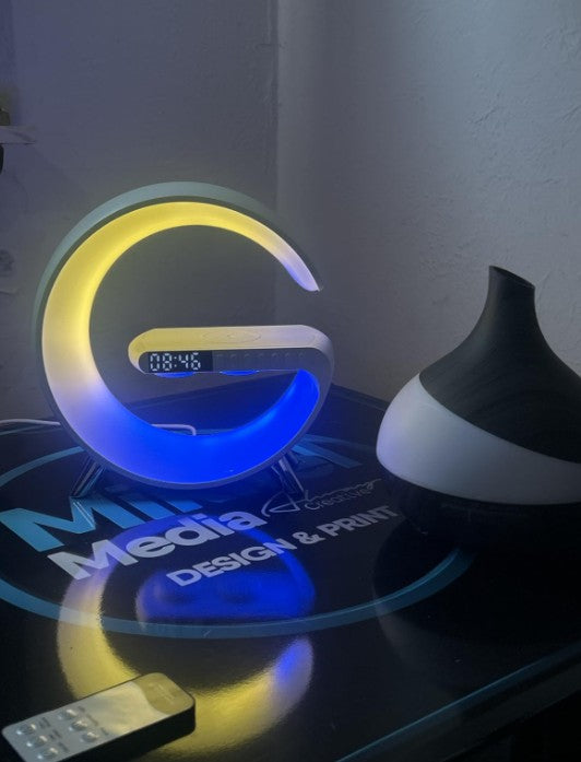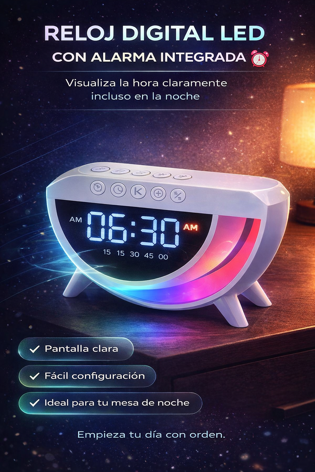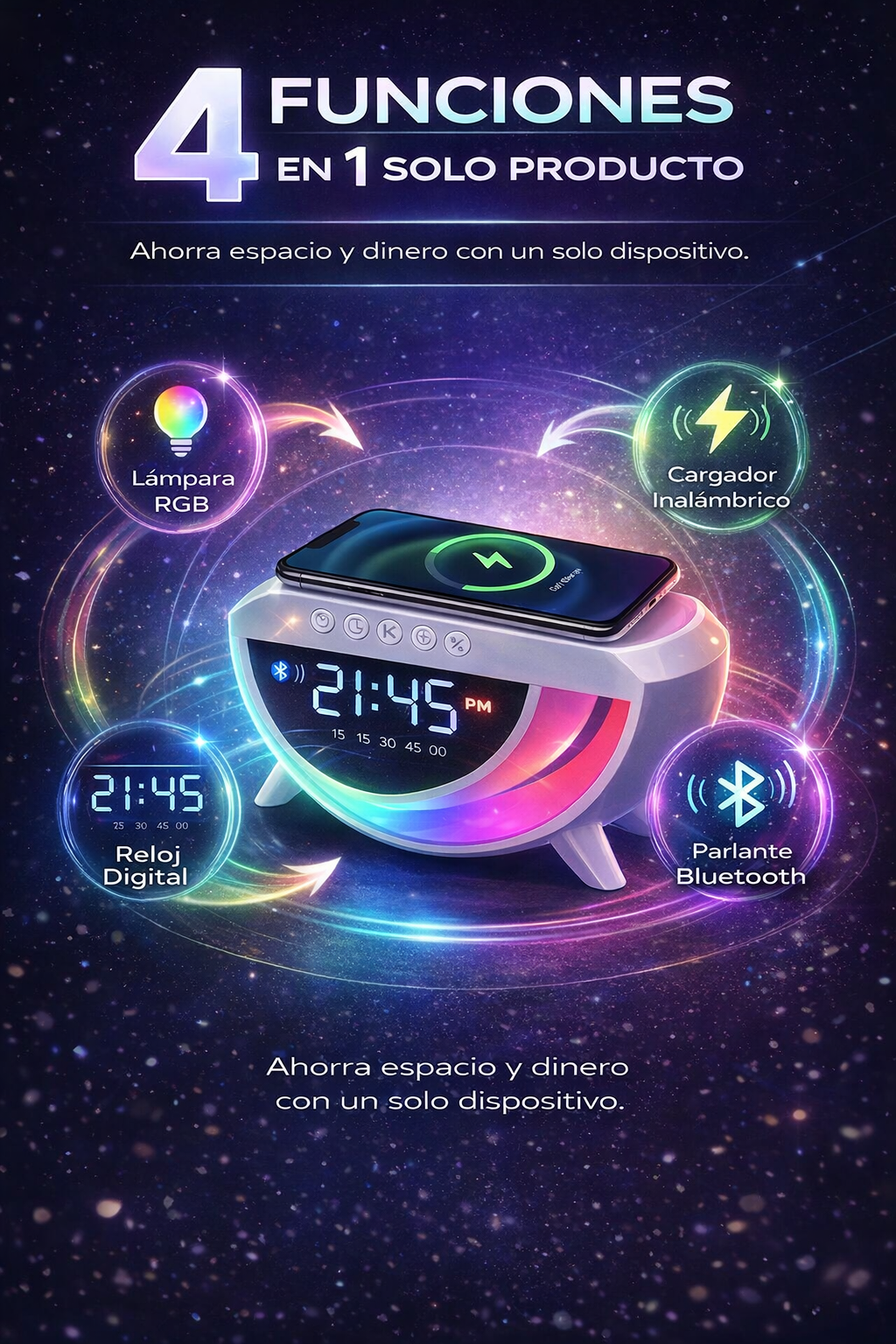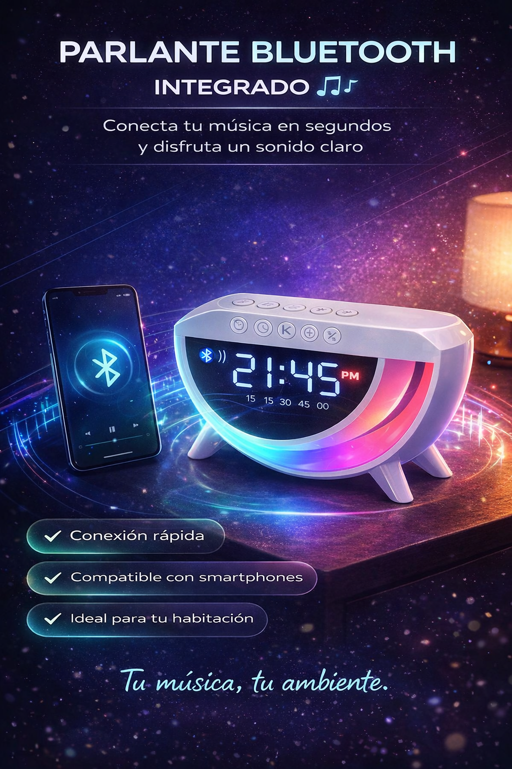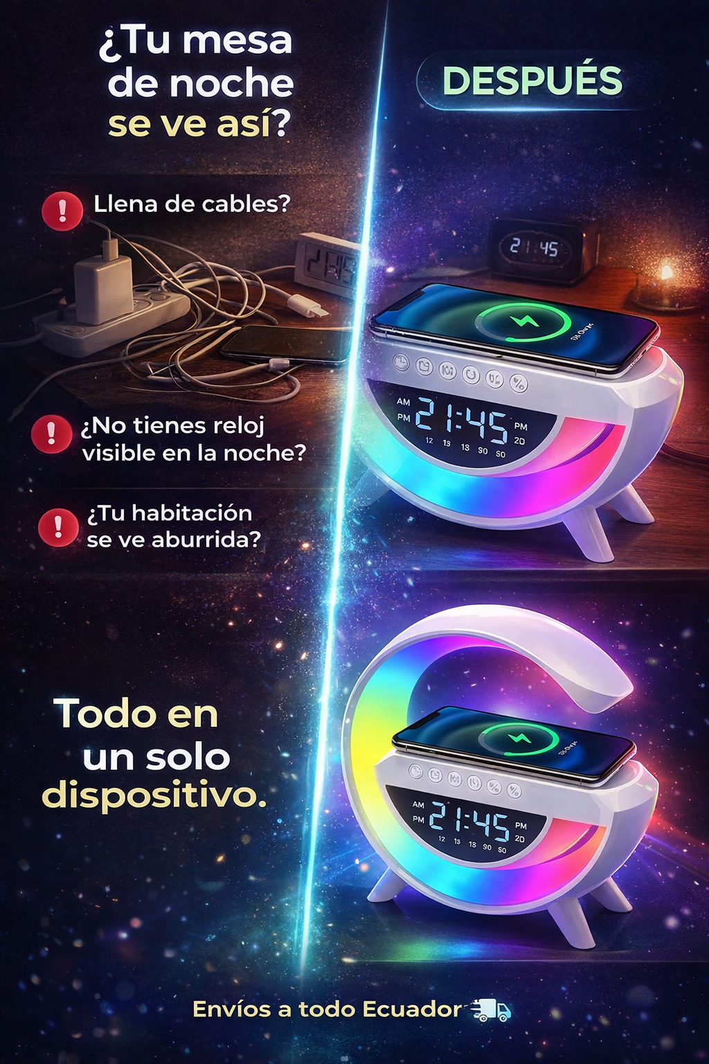 Antes tenía el cargador, el reloj y un parlante ocupando espacio y lleno de cables. Desde que tengo LunaSound Pro todo está limpio y ordenado. Se ve moderno y elegante. La luz RGB le da un toque increíble por la noche. Literalmente transformó mi habitación.